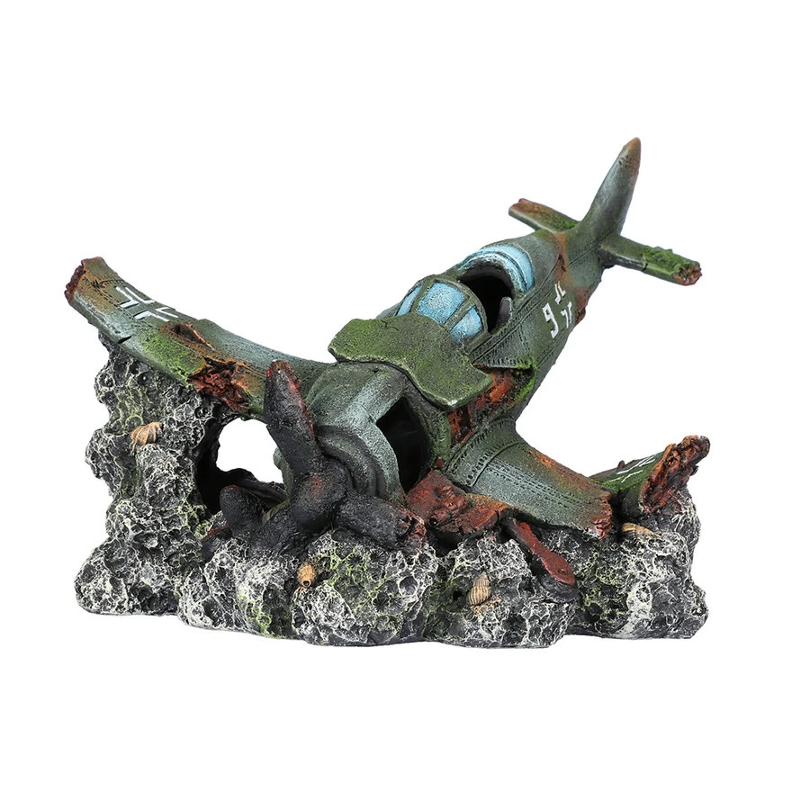 De Raven, een vliegtuigwrak neergehaald in de Tweede Wereldoorlog. Door een regen van kogels is dit ornament destijds beschoten en daardoor een uitdagend wrak voor vissen om te ontdekken. Dit ornament is gemaakt van Polyresin, 100% gifvrij en uiterst geschikt voor zoet- en zeewateraquaria.