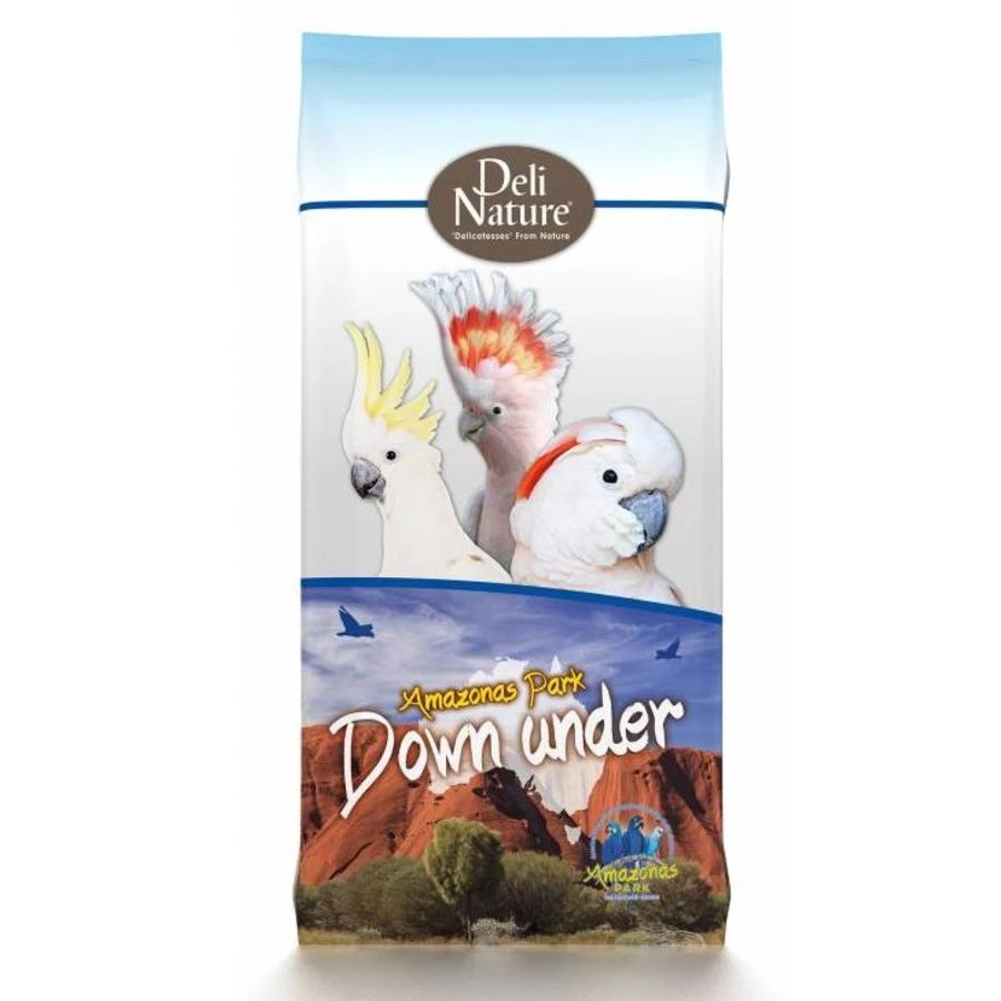 Deli Nature Amazonas Park Down Under is afgestemd op de behoeften van alle soorten kaketoes (uitgezonderd de rosé- en de palmkaketoe). Het is een lichte mengeling verrijkt met vitsen (bloem/plant) en een hoog aandeel kleinere zaadsoorten zoals kanariezaad, milletzaden enz.
