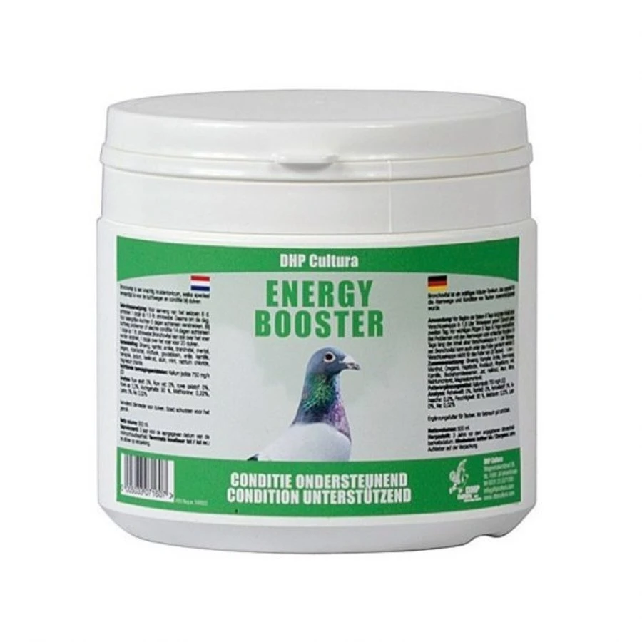 Energy Booster is samengesteld uit biologisch hoogwaardig eiwit met alle noodzakelijke toevoegingen als essentiële en non essentiële aminozuren, vitamine, mineralen, stuifmeelnectar en sporenelementen. Daarnaast bevat DHP Energie Booster de speciale aminozuur L-Carnitine, creatine plus, en HM: een leucine derivaat. DHP Energie Booster is belangrijk voor de voorziening van brandstof, kracht, energie en uithoudingsvermogen. Daarnaast is het een niet te vergeten factor bij eventuele verzuring. Uw duiven worden van Energy Booster ronder , voller, harder en blanker. Energy Booster is belangrijk voor een strakkere uitstraling, weerstand, uithoudingsvermogen, spieropbouw en graag willen vliegen.