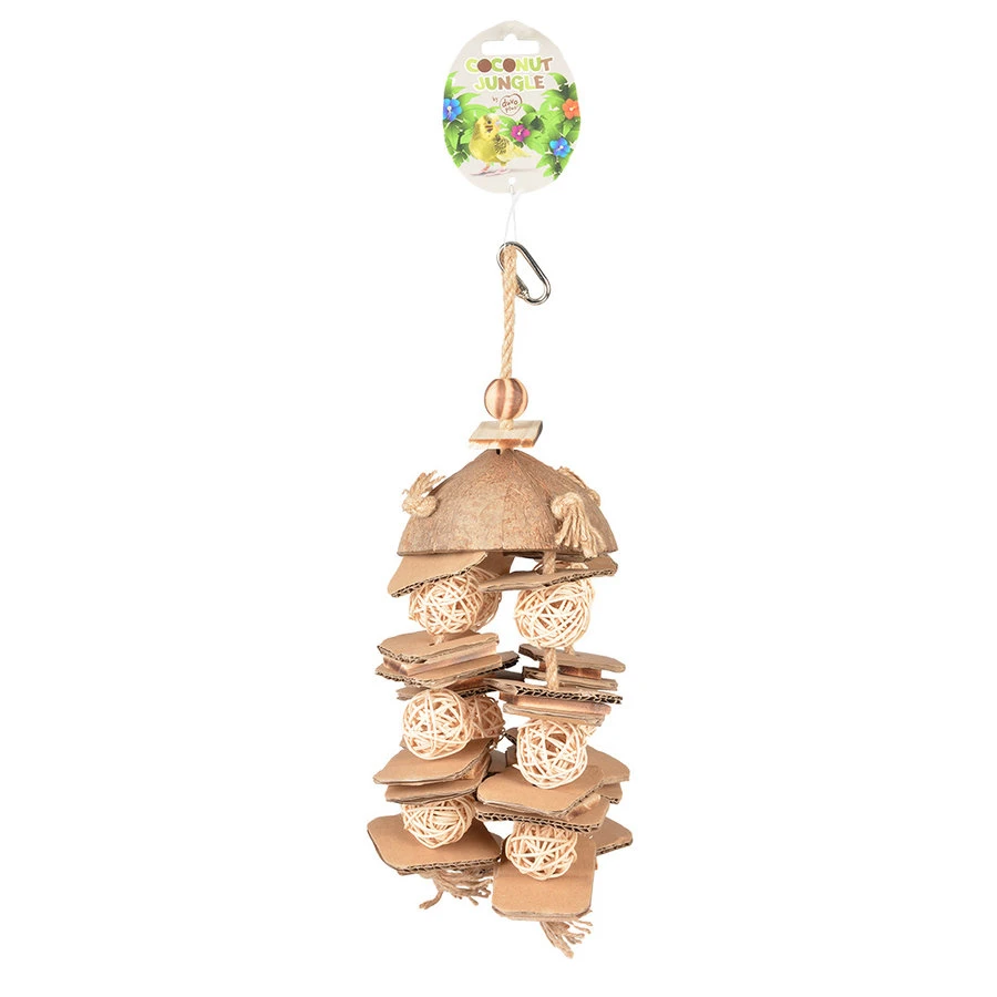 Deze coconut jungle hanger met wilgenballetjes en karton is geschikt voor alle vogel soorten en houd ze urenlang bezig. Het is ook ideaal om snacks in het speeltje op te verbergen en houd uw vogels uren bezig met klimmen en spelen. Gemaakt van Kokosnoten, wilgenballetjes en stukjes hout. De hanger is makkelijk te bevestigen in iedere volière.