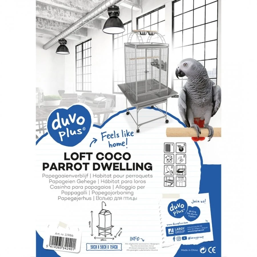 Het Duvo+ papegaaienverblijf Coco is een robuust en ruim verblijf voor papegaaien. De kooi heeft een opengaand dak met speelzone op het dak.