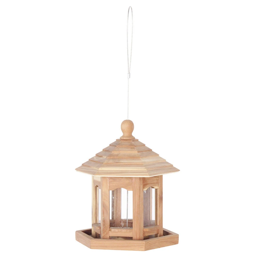 Deze uitvoering is voorzien van een hangkabel en heeft een zeshoekige vorm vervaardigd uit cederhout en oogt zo heel natuurlijk. De voedersilo heeft een landingsbalk rondom, veel plaats dus om het voeder te nuttigen.
