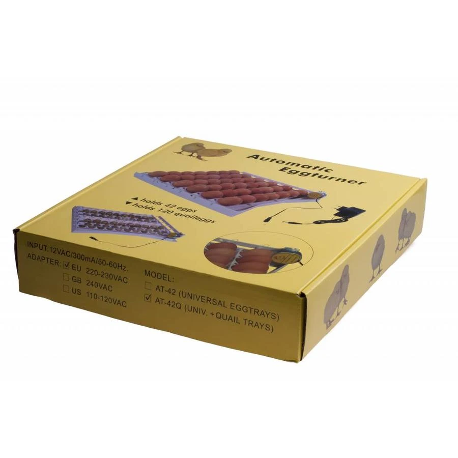 De sterke keermotor keert de eieren automatisch elke 2 uur. De motor wordt via een 30 centimeter snoer aangesloten op een 12 volt adapter (met 170 cm snoer, meegeleverd).