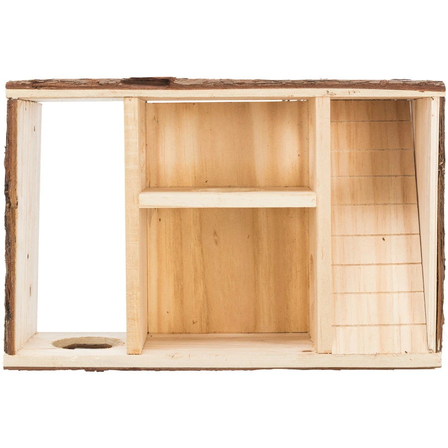Labyrinthuis Leif is het speel- en slaaphuis met helling en 4 kamertjes, waarvan 2 met verduisterd slaapgedeelte. In de slaapverblijven bevind zich een bodem en het dak is afneembaar. Het huis is gemaakt van schorshout en samen geplakt dankzij niet toxisch-lijm voor dieren. Ideaal voor bijvoorbeeld muizen en hamsters
