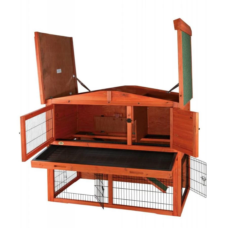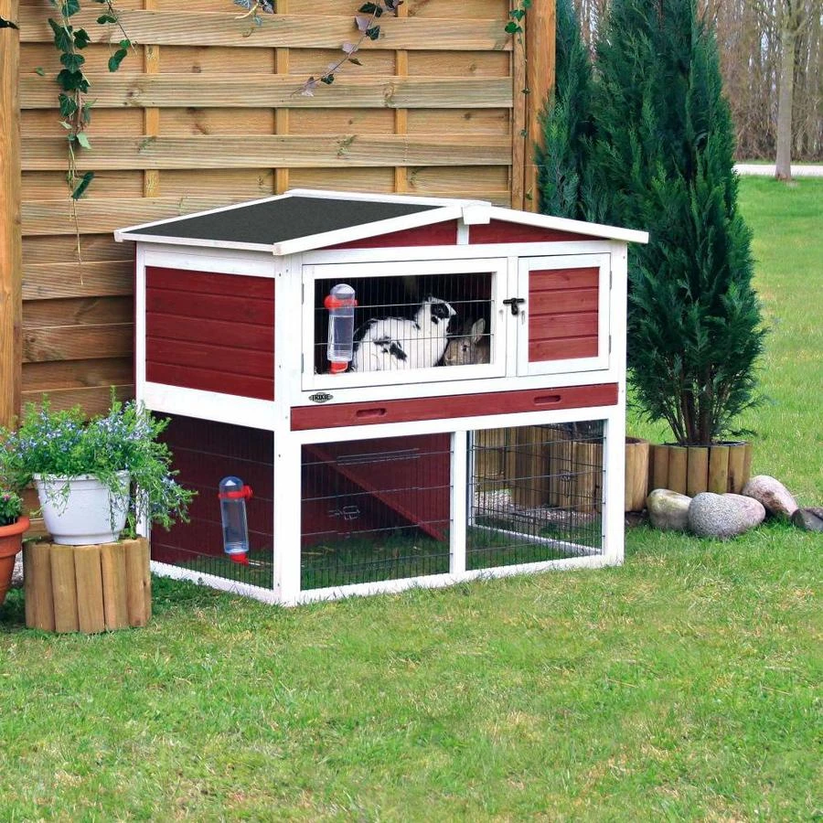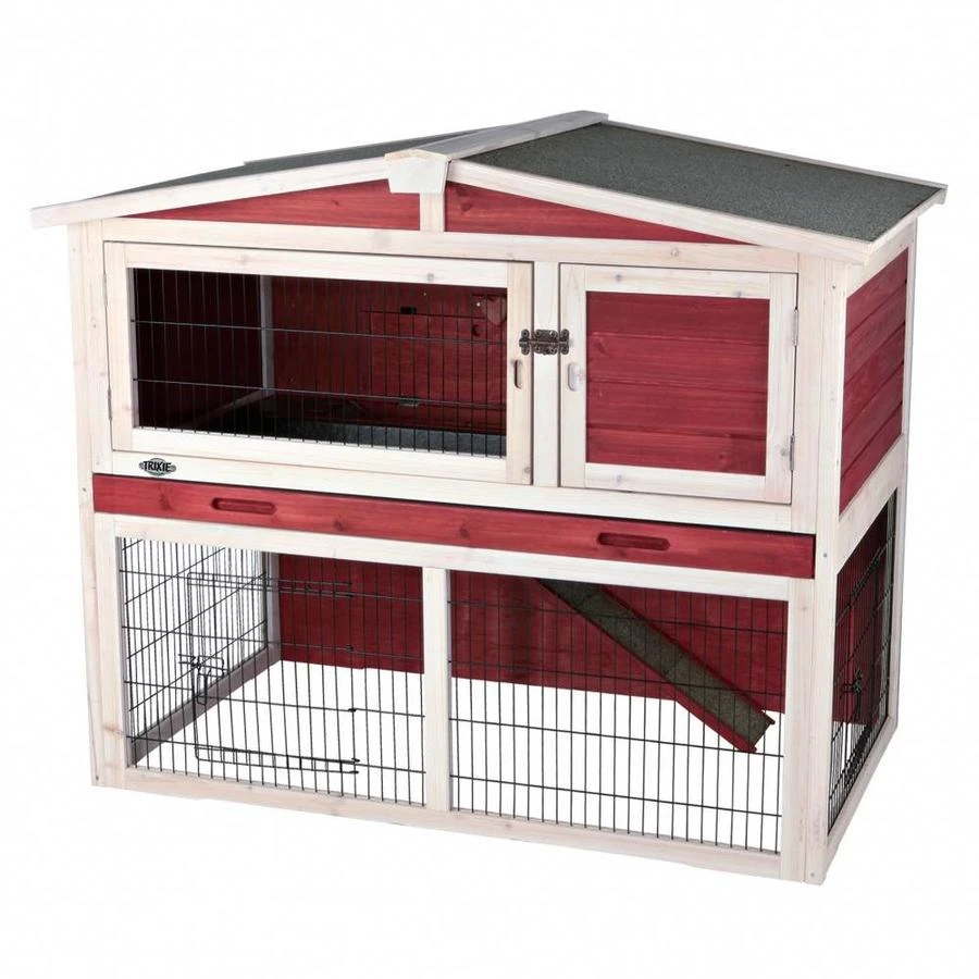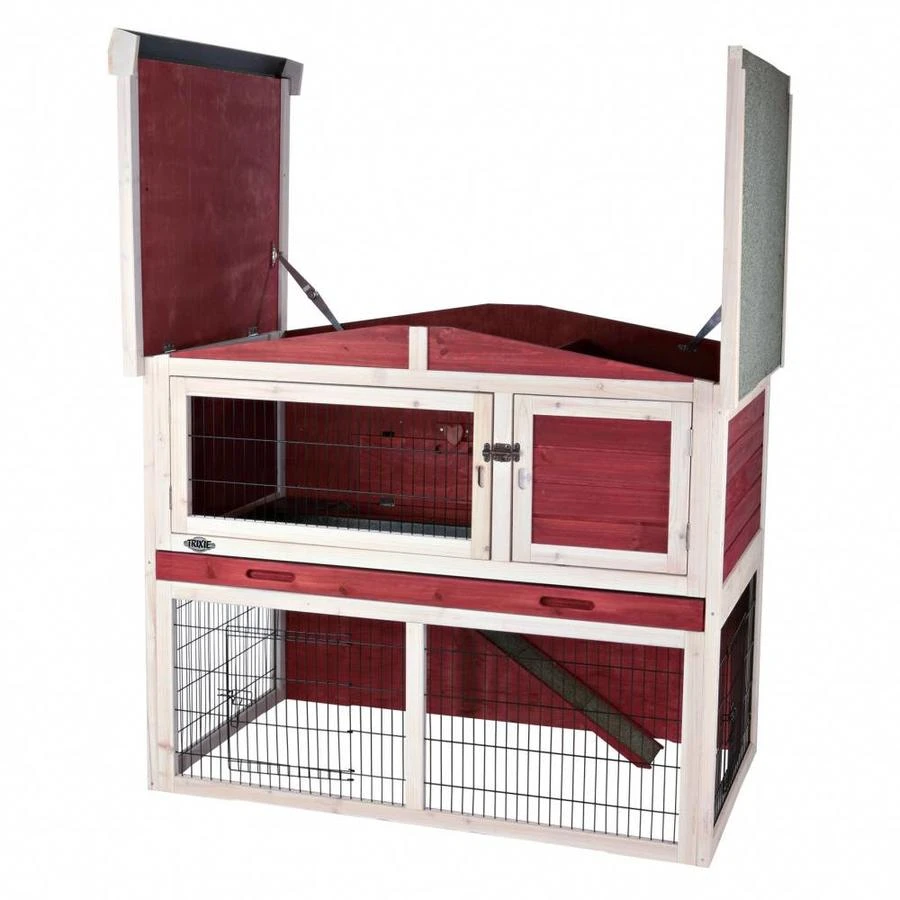 Dit luxe buitenverblijf met ren van Trixie is een compleet verblijf voor uw konijn of cavia. Het is gemaakt van gebeitst vurenhout met stevig metalen, gepoedercoat traliewerk en bitumen dak. Het verblijf bestaat uit twee verdiepingen met beneden een ren en schuilplek.