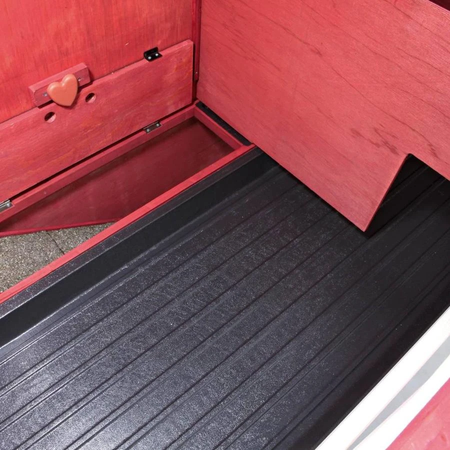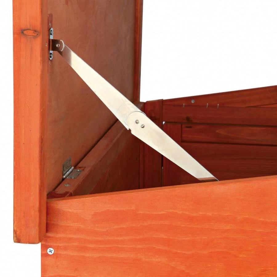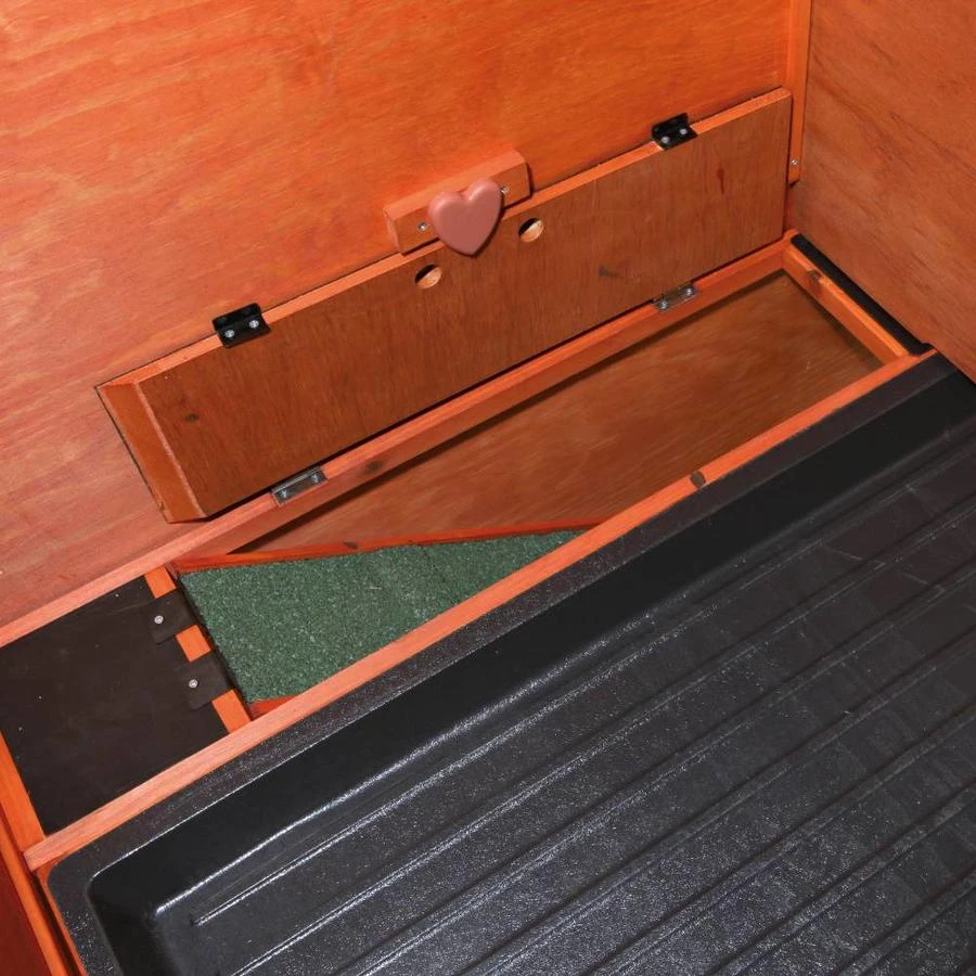 Door de kunststof uitschuiflade is het hok makkelijk te verschonen. De dakhelften zijn te openen zodat binnenin er makkelijk bij kunt. Door de geringe afstand tussen de spijlen (2 cm) in het traliewerk is het ook geschikt voor de opfok van jonge dieren.