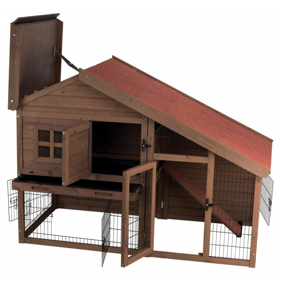 Het Trixie Groot buitenverblijf met ren is een compleet verblijf voor uw konijn of cavia. Het is gemaakt van gebeitst vurenhout met stevig metalen, gepoedercoat traliewerk en bitumen dak. Het verblijf bestaat uit twee verdiepingen met beneden een ren en schuilplek.