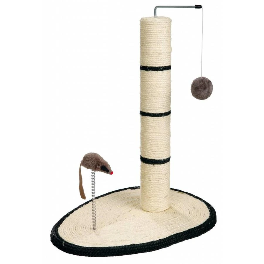Deze krabpaal is van top tot teen helemaal bekleed met sisal. Bovenop de top bevindt zich een draaibare houder met een speeltje aan touw. Aan de onderkant is een speeltje op een spiraalveer bevestigd.