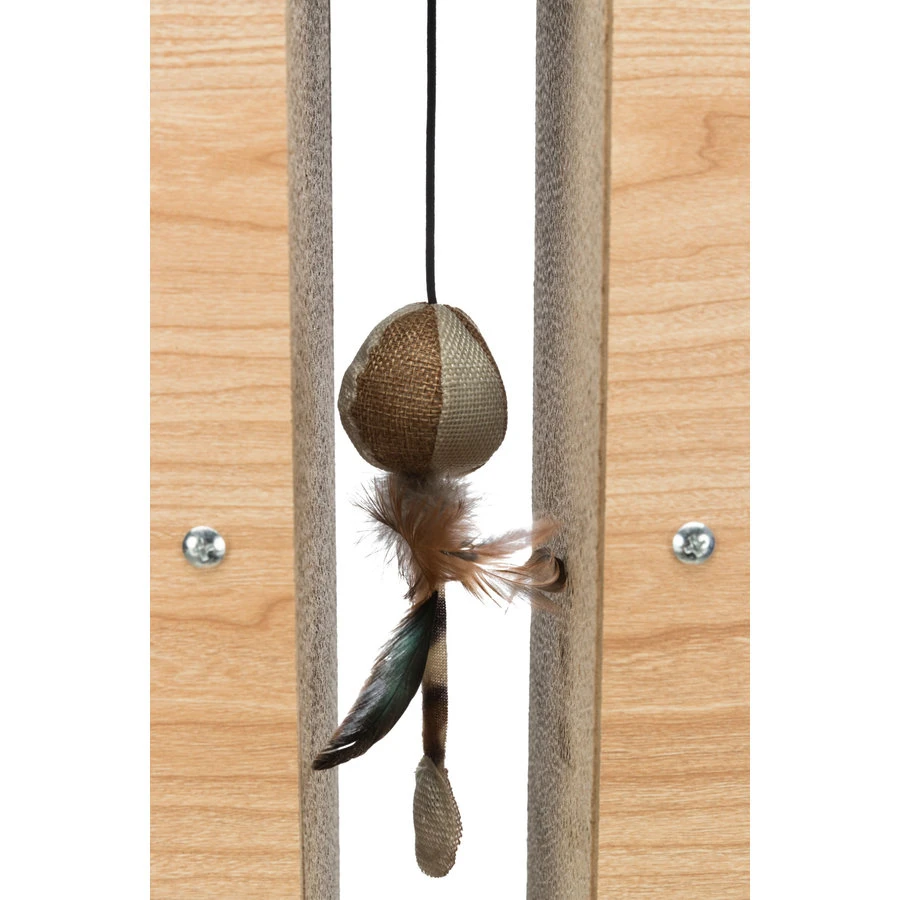 De krabzuil met verschillende elementen die het nog aantrekkelijker maken voor uw kat. Deze zuil bevat krabkarton/MDF/jute en een speeltje aan een koord. En om het meubelstuk nog aantrekkelijker te maken heeft het ook het ontspannende catnip.