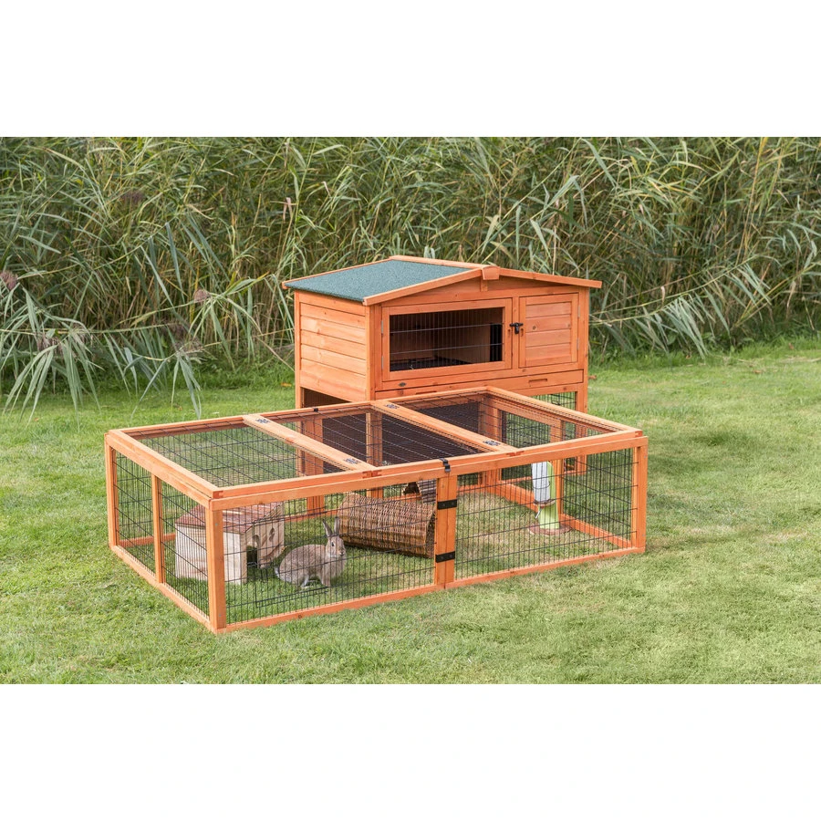 Dit rechthoekige ren met dak is de buitenren voor knaagdieren. Het dak is aan weerskanten opklapbaar. Met 2 kleine zijdeuren en uitneembare deur om een natura kleindierverblijf tegenaan te zetten. Deze ren is gemaakt van gepoedercoat metalen traliewerk en gebeitst grenenhout.