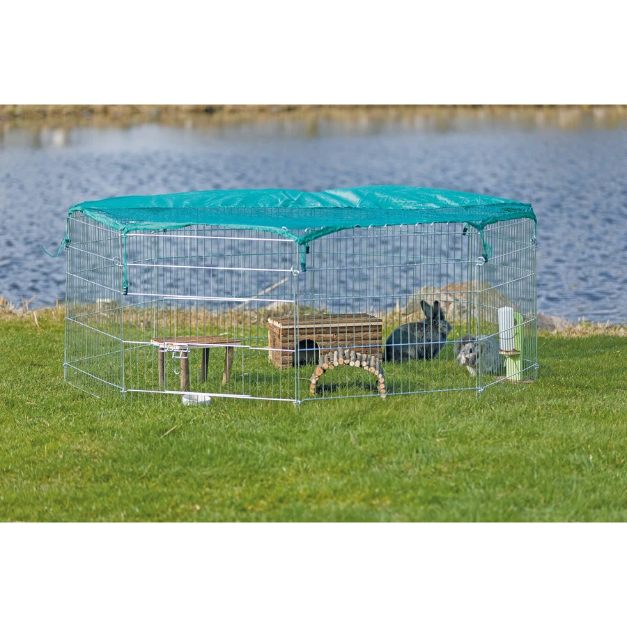 De Ren met een Veiligheidsnet welke eenvoudig in de tuin te plaatsen is en uw konijnen beschermt tegen de zon. Het beschermnet heeft een maaswijdte van 1 x 1 cm. De ene helft van het net is dicht en doet dienst als zonwering. De ren bestaat uit 8 panelen à 80 × 75 cm en kan met een extra paneel worden uitgebreid. De ren bevat ook een deur en inclusief haringen. Gemaakt van gepoedercoat metaal.