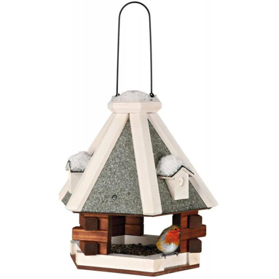 Stevig voederhuis voor buitenvogels, gemaakt van stevige materialen. Gemaakt van gebeitst vurenhout met een bitumen dak. Het voederhuis is bedoeld om op te hangen.