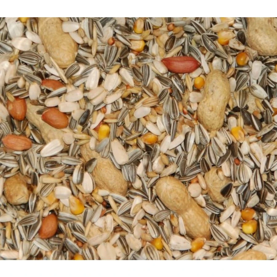 Dit papegaaienvoer is een gevarieerde mengeling met doppinda’s, mais en gestreepte zonnebloempitten.