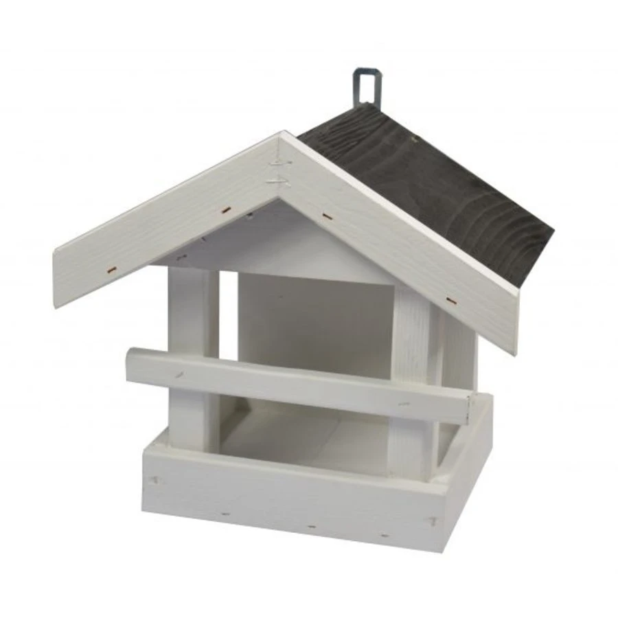 Voederhuis Quinty heeft een mooie moderne uitstraling. Het hout is gebeitst in een witte kleur en het dakje in een zwarte kleur. Door middel van een bevestigd haakje aan de achterkant is het voederhuis Quinty eenvoudig en snel te bevestigen aan een haak of spijker aan de muur of schutting.